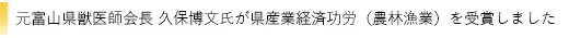 去る令和7年10月25日、富山産業展示館(テクノホール)において、富山県農林漁業功労者表彰式が行われ、当会元会長の久保博文氏が、「多年にわたり獣医師会の要職にあって、県民の獣医師に対する理解促進や家畜伝染病への対応に取り組むなど、本県畜産業の振興に寄与した」との功績が認められ、富山県表彰規程による表彰、県産業経済功労(農林漁業)を受賞されました。これまでのご苦労が実を結んだものと考えられます。